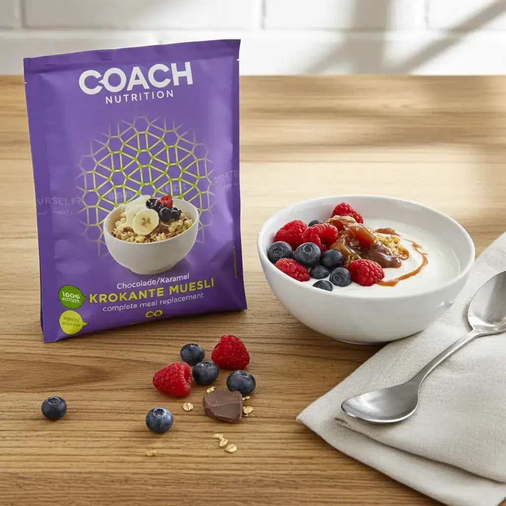 Plantaardige krokante muesli Chocolade-Karamel als maaltijdvervanger voor gewichtsbeheersing. Handige 47 g sachets. Ideaal in de opbouw/afbouwfase of als alternatief bij lactose-intolerantie en een vegetarische/vegan leefstijl.